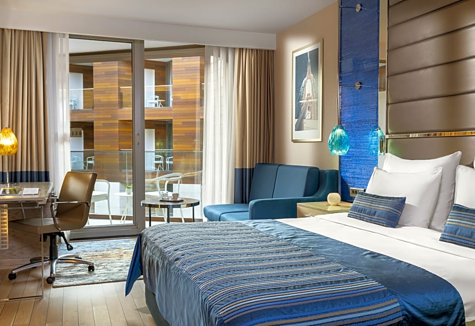 Indulge in our spacious 1 King Junior Suite with stunning sea view and club lounge access. This 560 sqft suite accommodates 4 adults and 3 children, featuring a queen-size bed and a sofa bed, air conditioning, bathtub, balcony, and private bathroom.